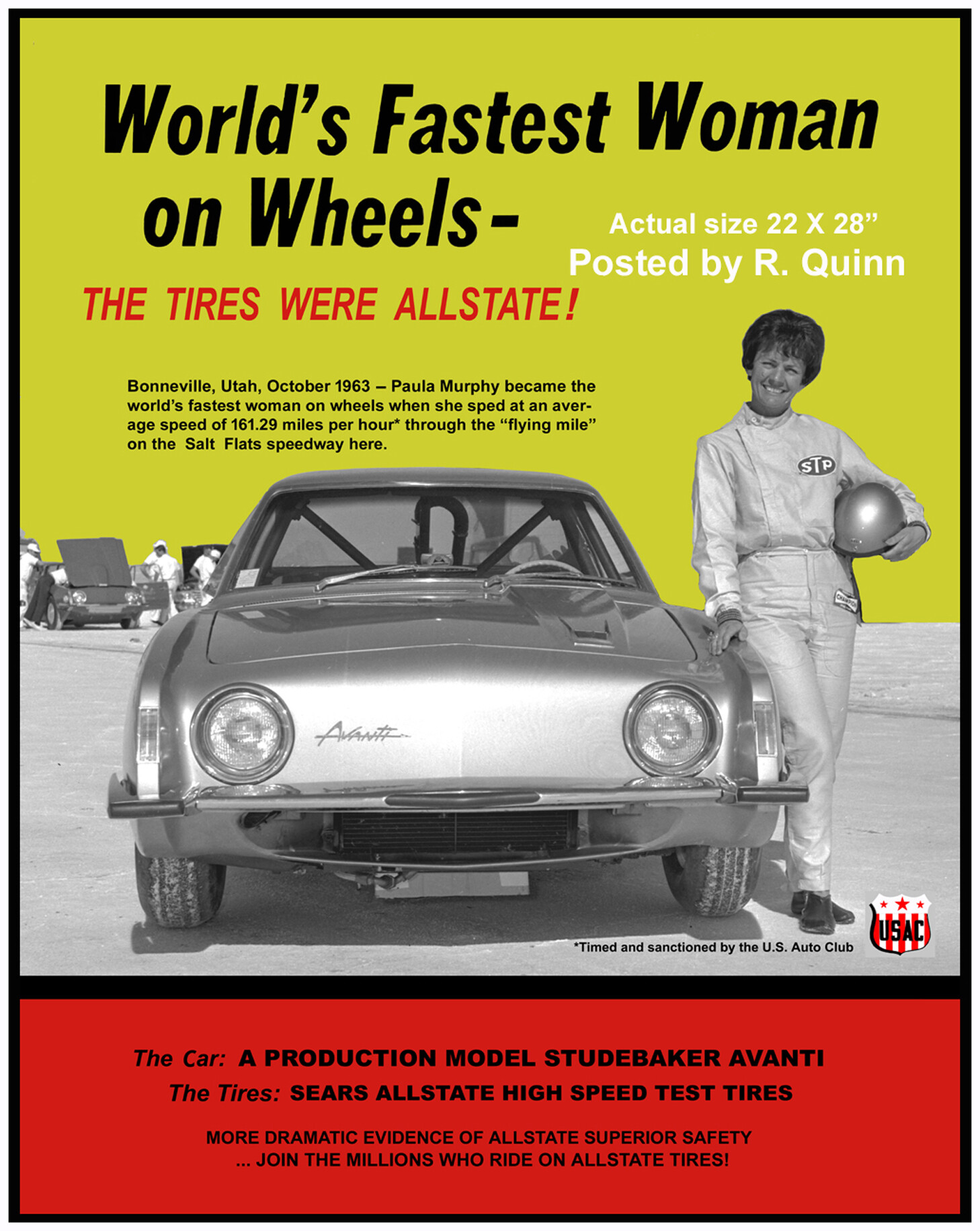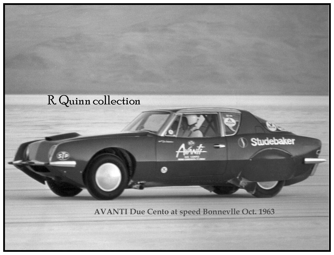 This is the extra-high-performance Avanti Due Cento model, at Bonneville, in 1963. Despite the plan to hit 200 mph, they were only able to get it up to 196 mph, due to a wet surface.